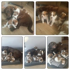 April 2015 is Kyra met succes meerdere malen gedekt door haar grote vriend Karel ( Carlo van het Beloken Land) In de nacht van 15-16 juni 2015 is Kyra bevallen van 9 puppy's; 3 reutjes en 6 teefjes. Heel bijzonder op 2 datums en het aantal pups is voor Kyra spectaculair. Kyra is een echt moedertje, op en top verzorgt zij haar kroost en totaan de laatste dag mogen de pups een slokje halen. Fijn dat Kyra dit nog weer eens mag meemaken. Het nest zal de letter D krijgen. Nadat onze beide dochters de namen hadden bedacht bij eerdere nesten, vond zoonlief Dennis, dat hij nu ook de namen van een nest pups mocht bedenken, toch wel leuk vond hij. De reutjes heten: Dennis/Douwe/Dexter; de teefjes heten: Denise/Donna/Daisy/Do/Doutzen/Dipsy. De namen zijn familie- verhalen gerelateerd zeggen we maar. Ons eerste zomernest, zo leuk.